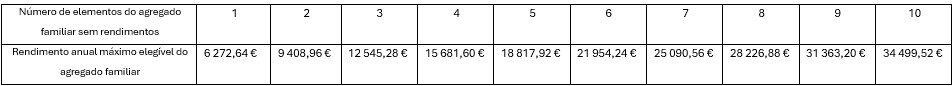 Rendimento anual: Caso não se enquadre em nenhuma destas prestações socias, saiba que são ainda considerados beneficiários da Tarifa Social os agregados familiares, cujo rendimento anual seja igual ou inferior a 6272,64 €, acrescido de 50 % por cada elemento do agregado que não tenha qualquer rendimento, incluindo o próprio até ao máximo de 10 (ver tabela).
